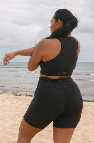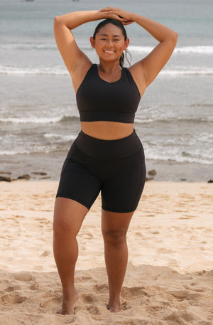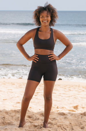 Jawa is wearing the Training sports bra and Upstate bike shorts in small