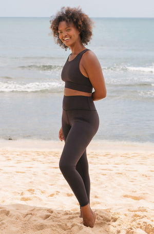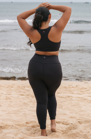 Our Hustle leggings has a high-waisted cut that sits securely and pairs perfectly with all our sports bras!