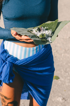 Maya is wearing the Haapiti Sarong with Scorpion Top in Indigo and Lucky Bottom in Powder Blue Stripe