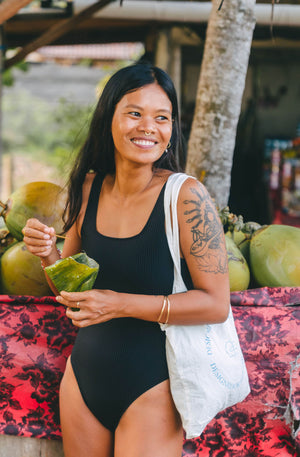 Stumbled across this suit at the Xanadu surf shop on Lombok and loved the green bean print! But ahh the fit is amazing. Truly one of the first surf bikinis that I feel confident wont fly off if I get hit by a big wave. I bought the same style in red too! So cute and *actually functional!