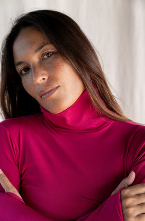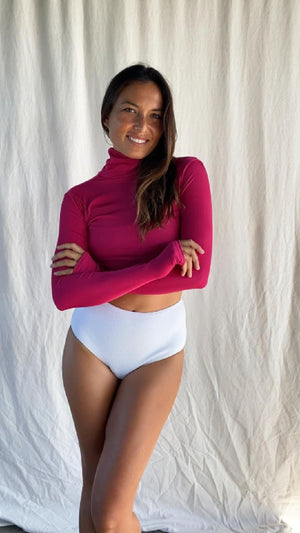 Designed for ultimate sun protection and performance, this long-sleeve cropped rash guard features a high-neck turtleneck to shield you from harsh rays, while the sleek, stay-put fit ensures zero bunching or twisting while you surf. Made from sustainable ECONYL® ribbed fabric, it’s lightweight, breathable, and built for long days in the water.