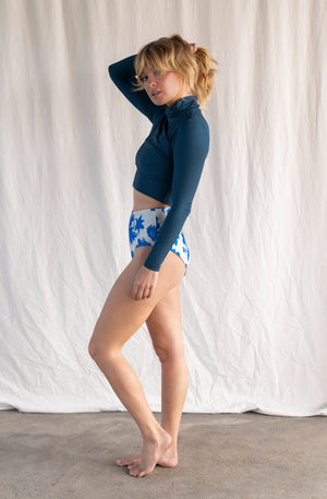 Designed for ultimate sun protection and performance, this long-sleeve cropped rash guard features a high-neck turtleneck to shield you from harsh rays, while the sleek, stay-put fit ensures zero bunching or twisting while you surf. Made from sustainable ECONYL® ribbed fabric, it’s lightweight, breathable, and built for long days in the water.