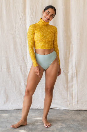 Grace is wearing the Scorpion crop sun top and the Eros bottoms in Sun Ray Gold Print and in Lichen in small