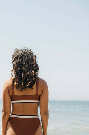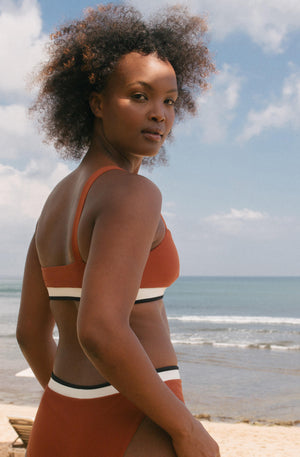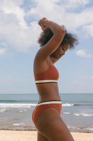 Designed for leisure, but built for performance, the Elise bottom is our favorite versatile bikini bottom. Cut to sit on the natural waist with a high leg opening to elongate the leg. The precision of tailoring and clean elastic waistband with contrasting color binds together and ensures a perfect fit and support for surfing or enjoying the sun.