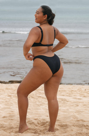 We collaborated with the beautiful and celebrated longboarder - Lola Mignot, to design the perfect surf bikini bottom. The Lolita offers just the right amount of front and bottom coverage, while its high-cut leg is beyond flattering. Don't be fooled by the minimalist design, it has been tested to stay put when surfing or taking walks on the beach.