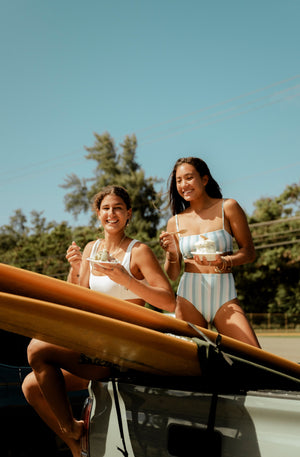 Kayla, Mahina and Julia are wearing the Atoll top and Lucky bottom in small