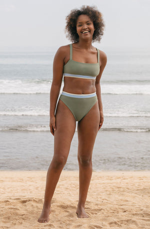 A pared-down minimalist bandeau silhouette is flattering on every body type. The Grace is a surf bikini top designed with supportive straps and contrast elastic band under the bust to ensure comfort, versatility and performance.