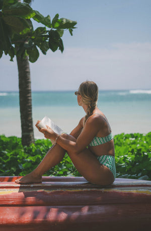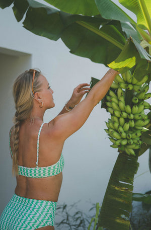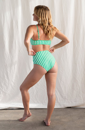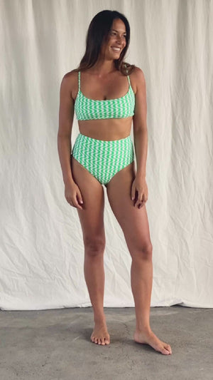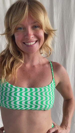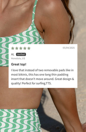 Our new River Bikini Top in Wave Green Bean Print—a fresh take on ourretro-inspired, surf-ready essential. Designed foractive movement and all-day comfort and made fromsustainable ECONYL® fabric, this top featurescontrast binding for a sporty edge andremovable padding for customizable support.